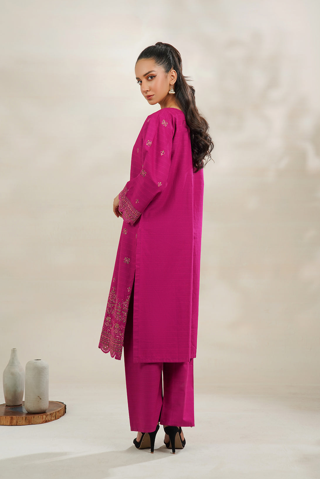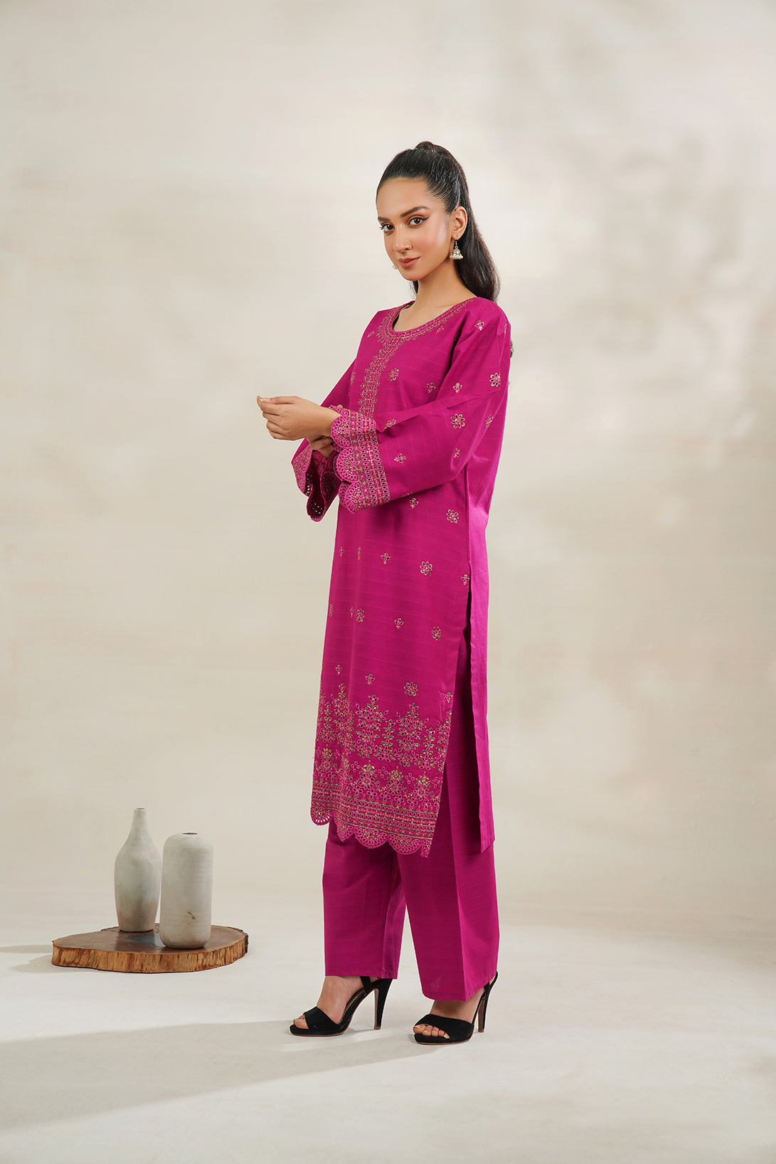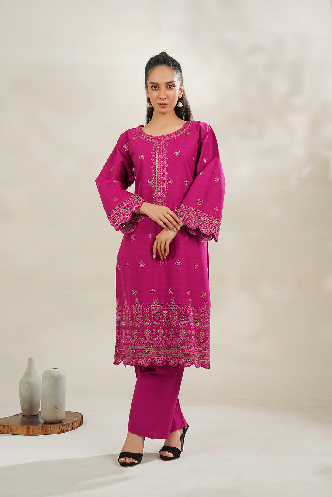 This is a two-Piece Stitched outfit come with cambric bright Embroidered shirt and trouser