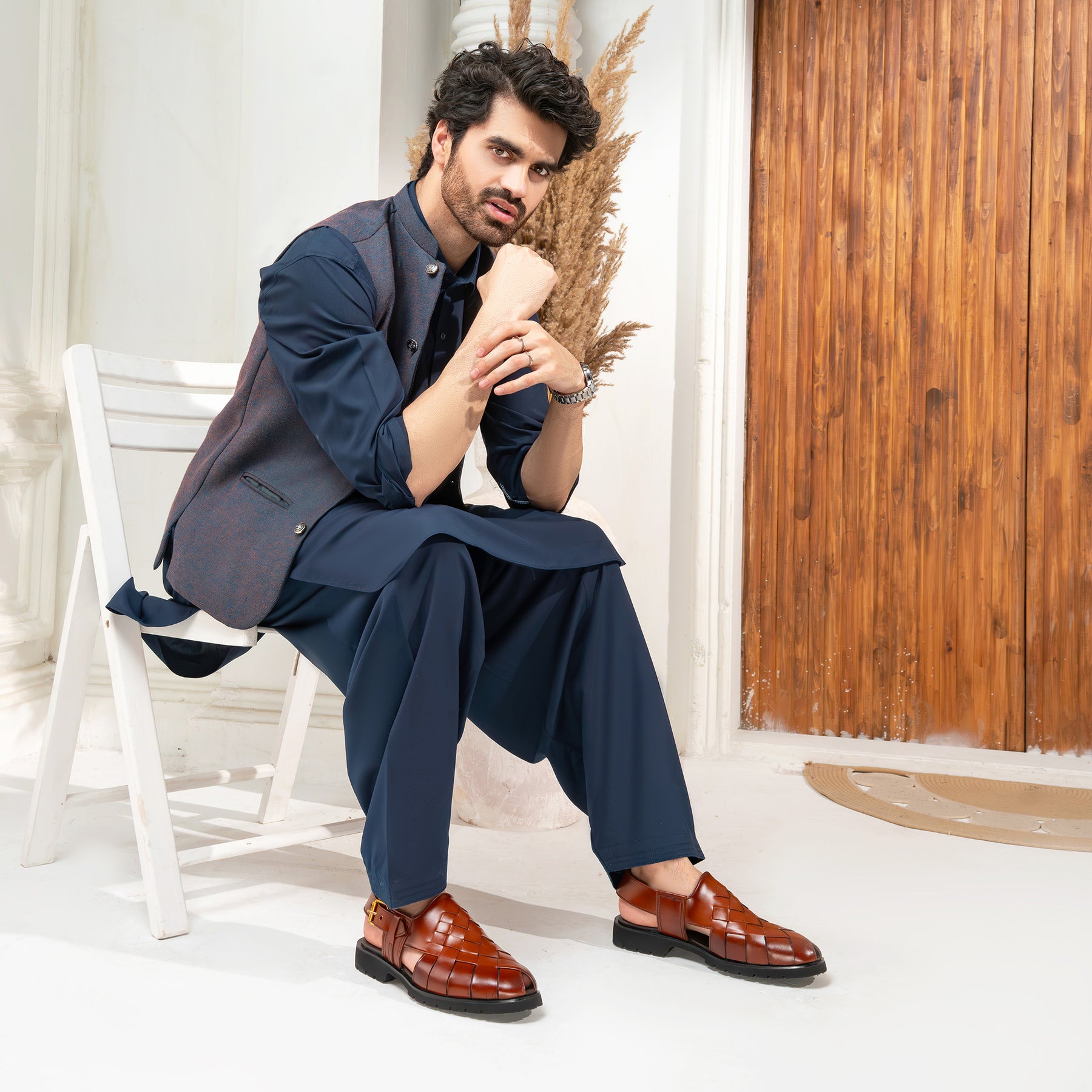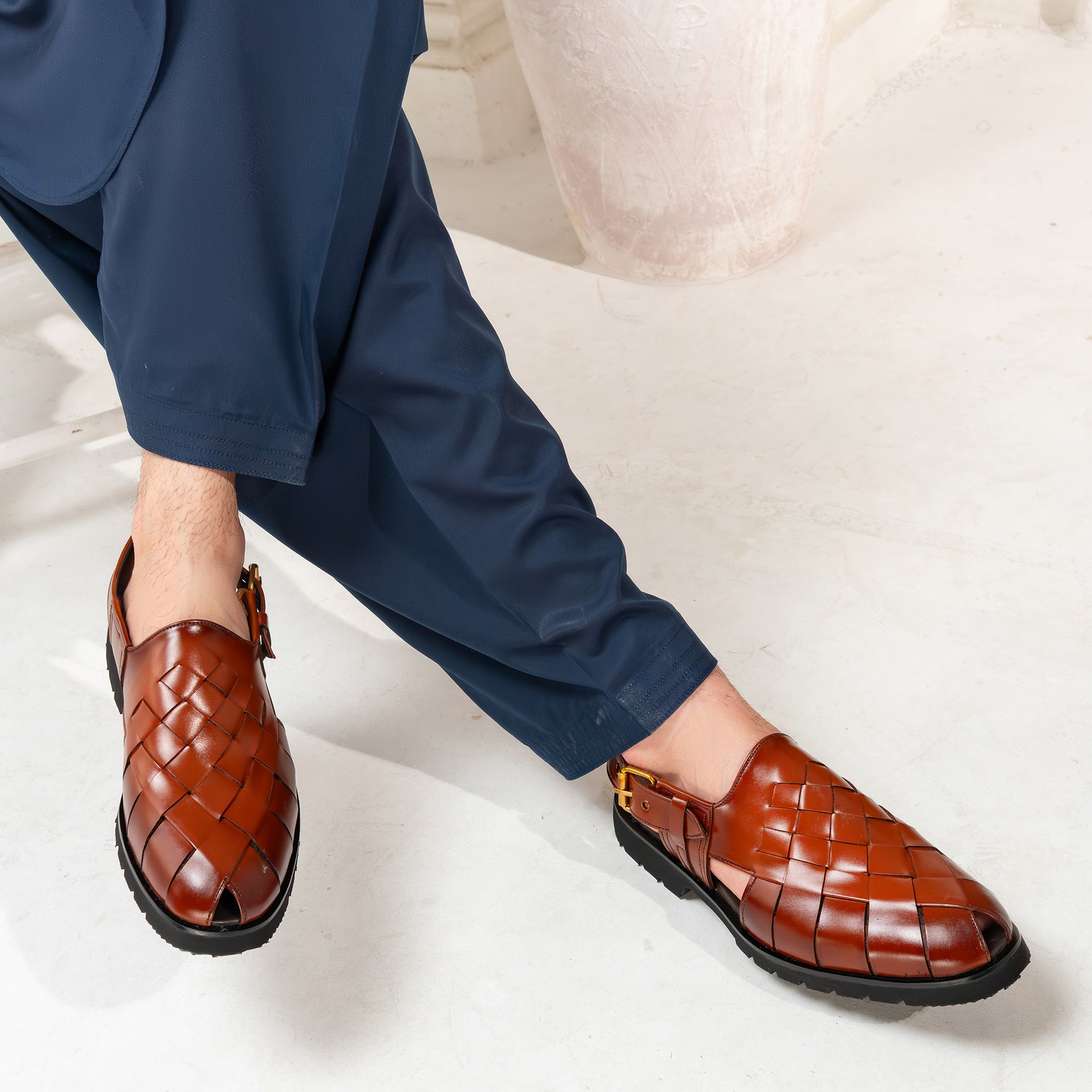 Clive Peshawari is a semi-closed shoe which consists of two wide straps crossed and joined with the sole, plus a strap with a buckle to tie according to the foot size and level of comfort which gives you a more elegant look