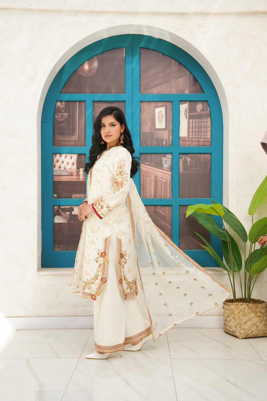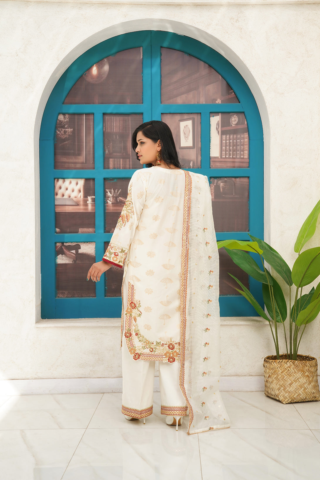 This is a three-piece stitched outfit come with Jacquard Embroidered Shirt Embroidered Dupatta and Trouser
