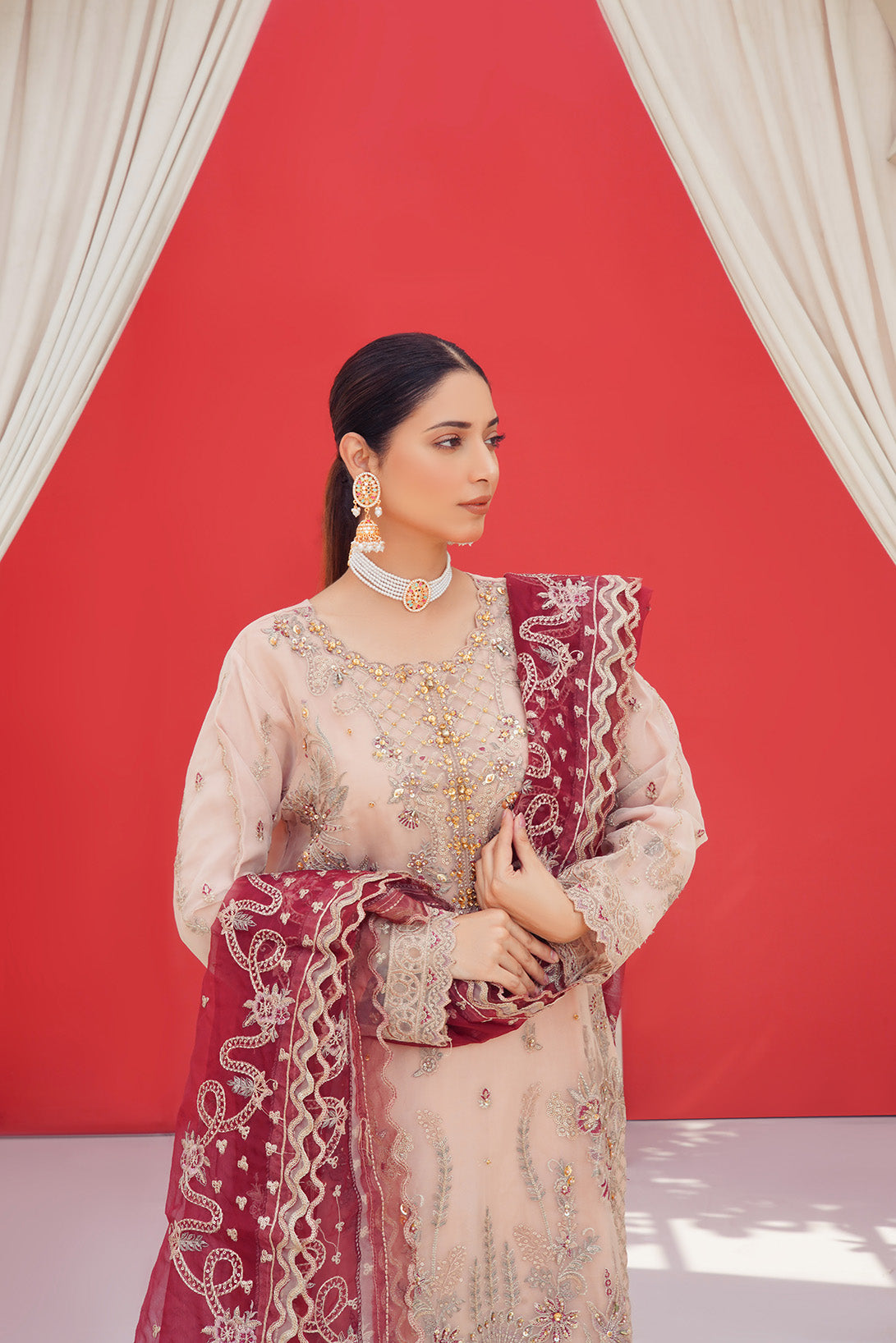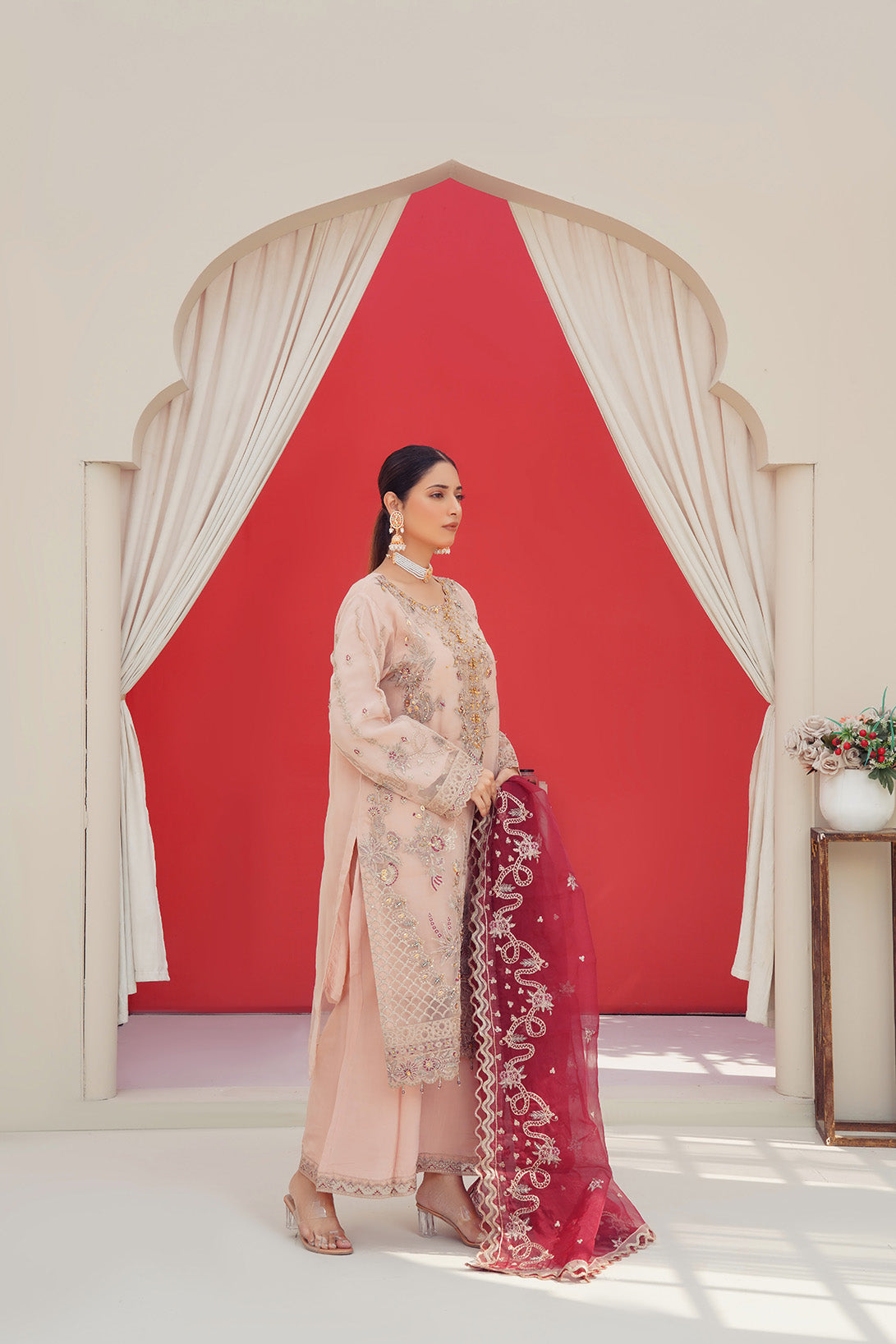 This is a three-piece stitched outfit come with organza Embroidered Shirt Embroidered Organza dupatta and Raw silk Trouser