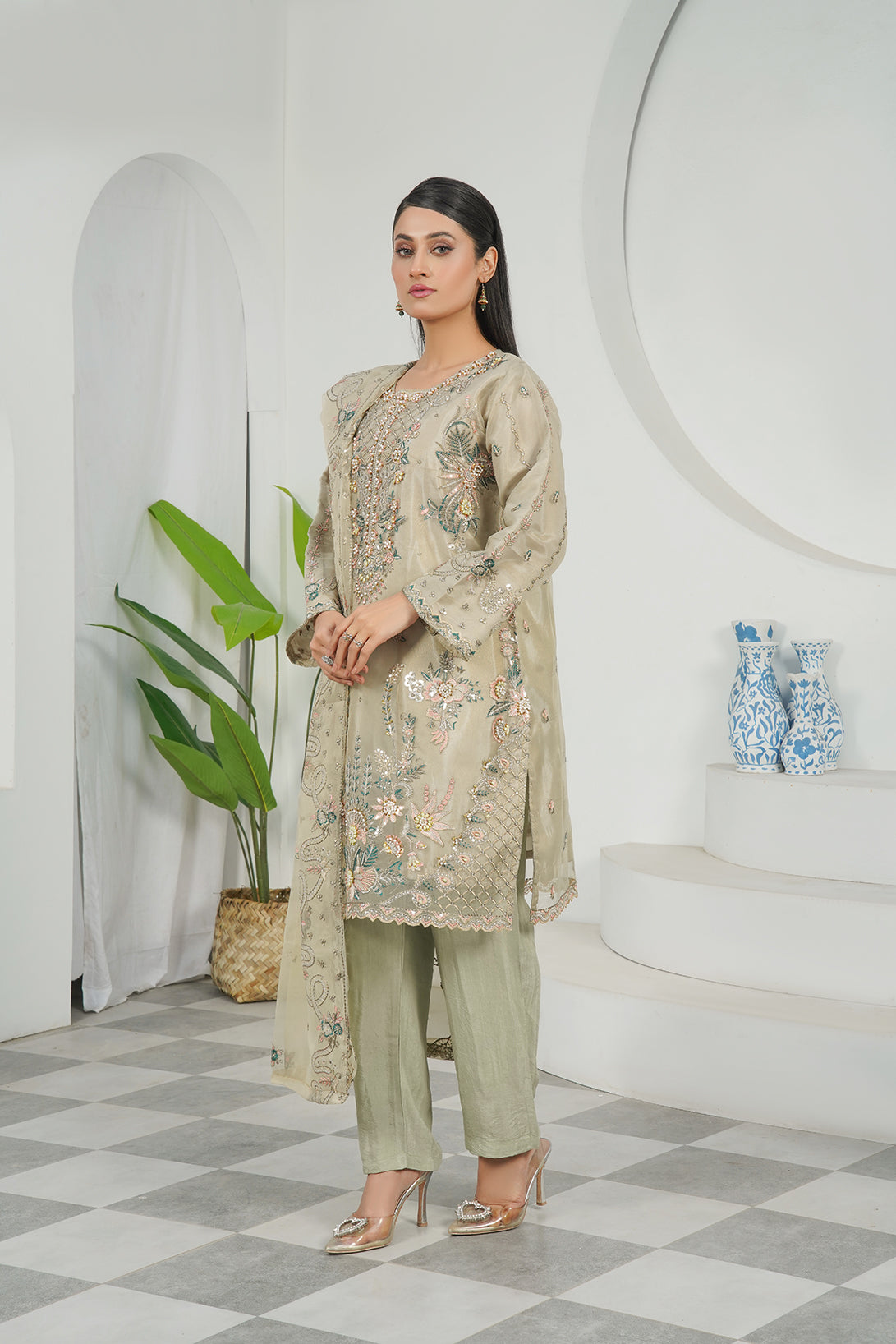 This is a three-piece stitched outfit come with imported organza luxury hand work Embroidered shirt Embroidered dupatta and trouser